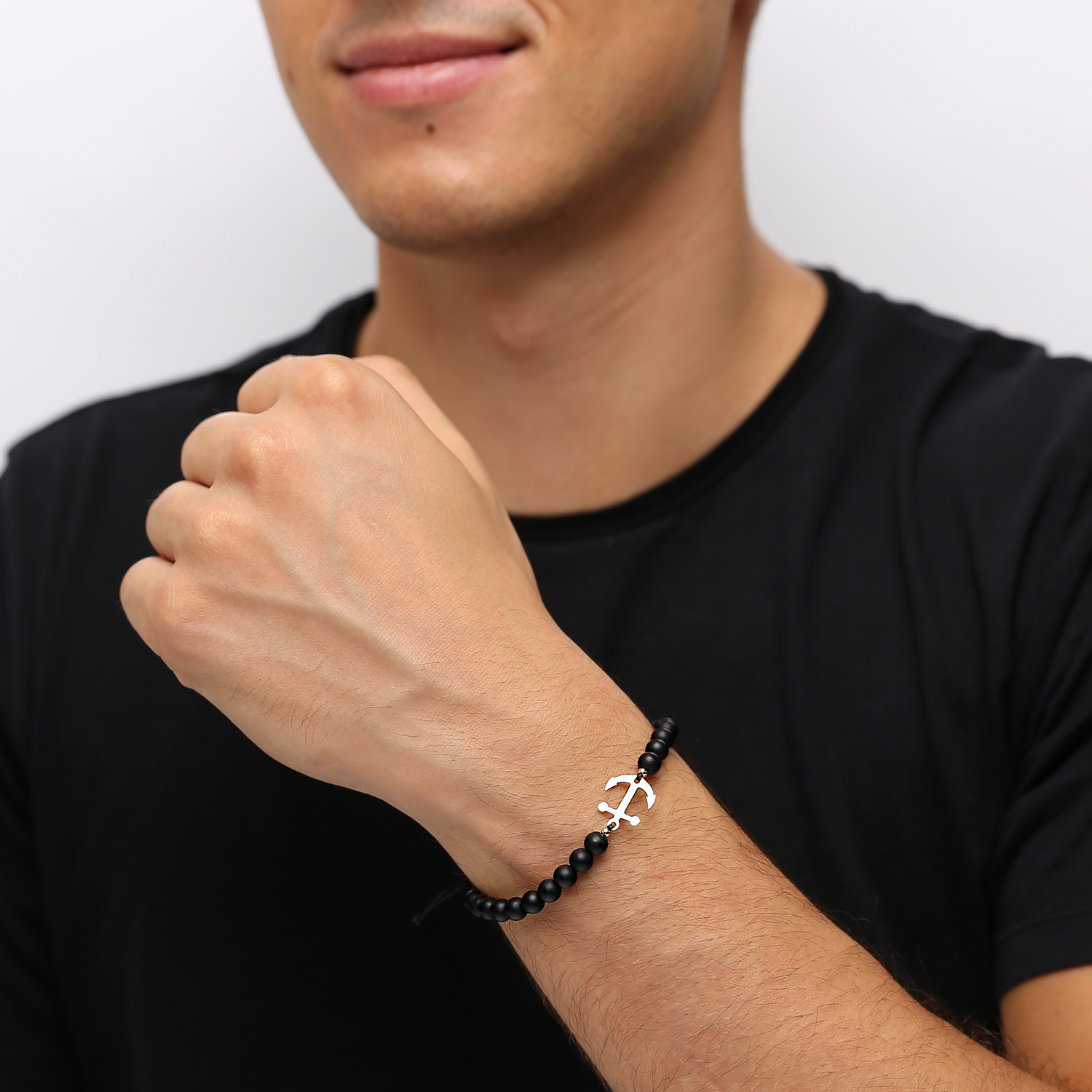 Herrenarmband gebrauch: Für stilvolle und selbstbewusste Männer. Anhänger in Form eines Ankers aus Goldmuster 585 (14 Karat) auf schwarz schlüsselband mit Perlen -Hämatit. Am Handgelenk getragen, begleitet von einer Markenuhr, unterstreicht sie perfekt den hohen Status des Trägers. Die verstellbare Größe sorgt für eine perfekte Passform am Handgelenk und ist eine ideale Geschenkidee.