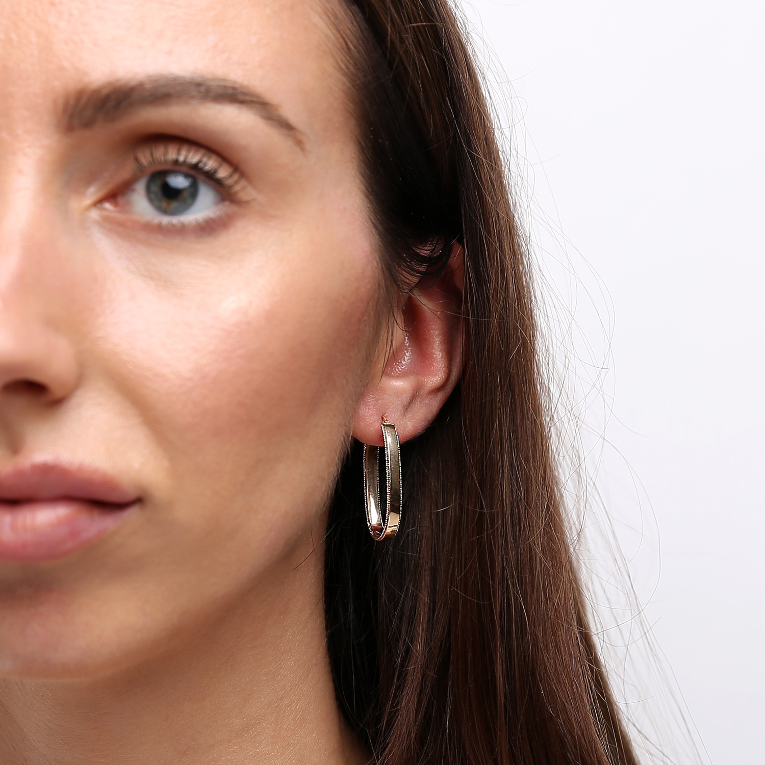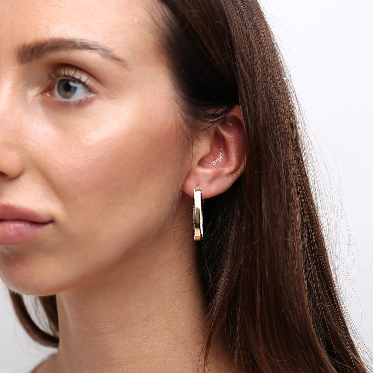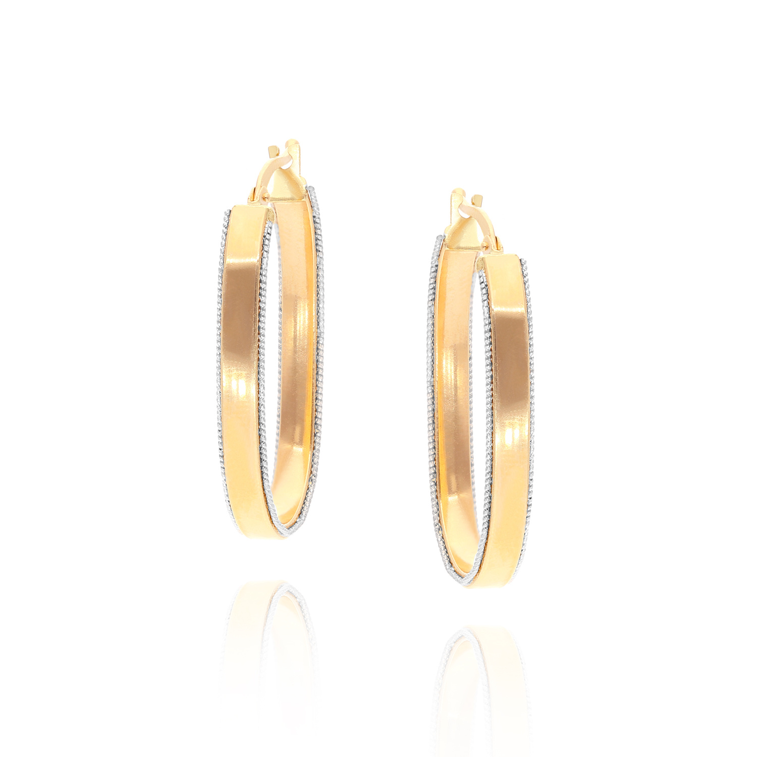 Schöne längliche kreisförmige Ohrringe. Hergestellt mit der größten Sorgfalt aus weißen und gelben 585-Probe Gold - 14 Karat. Die kreisförmigen Ohrringe sind an den Rändern mit einem Muster aus Weißgold verziert, das sie im Licht schön glänzen lässt. Echter Schmuck - ein Muss für jede kämpferische und selbstbewusste Frau! Ideal als Geschenk für einen Freund oder eine geliebte Person.