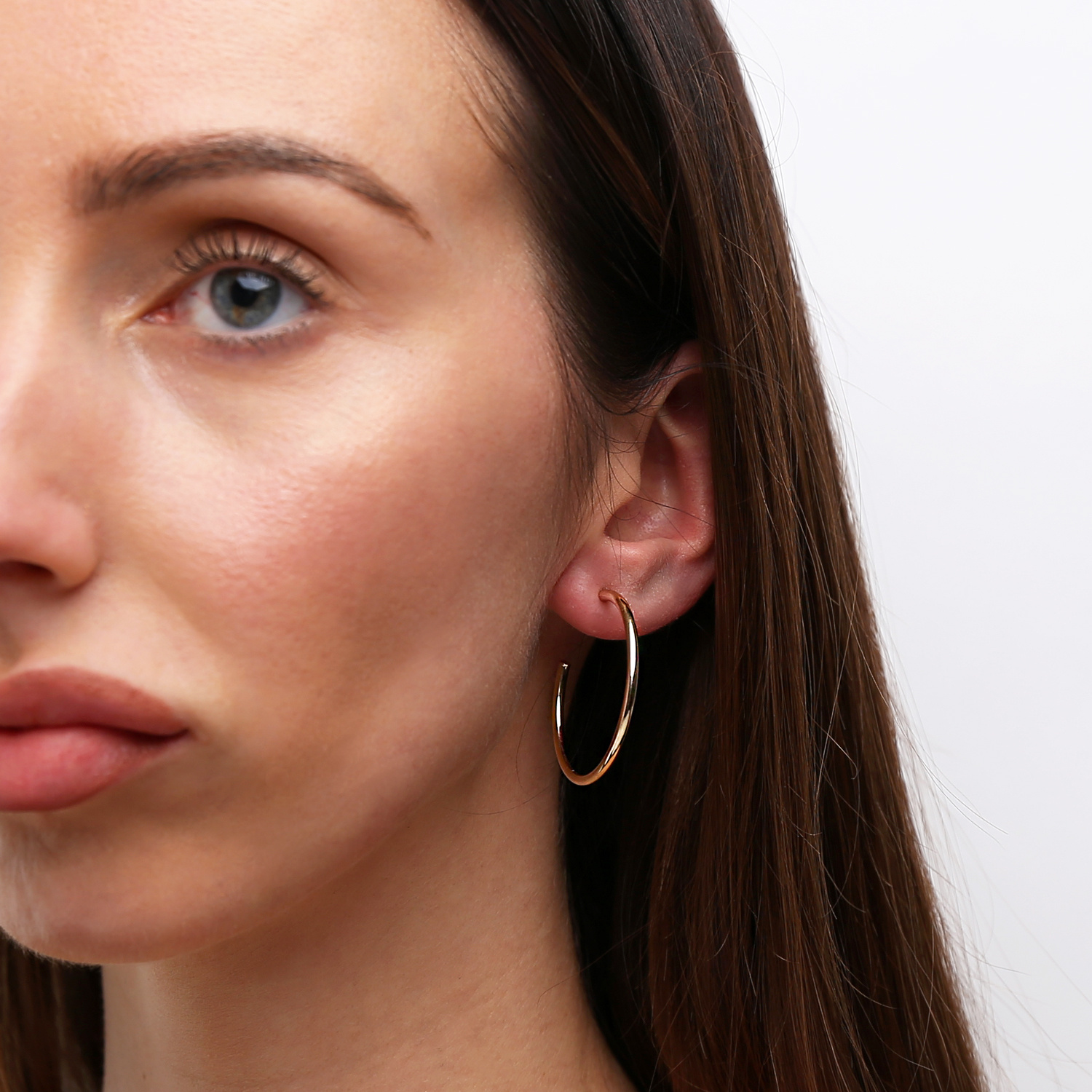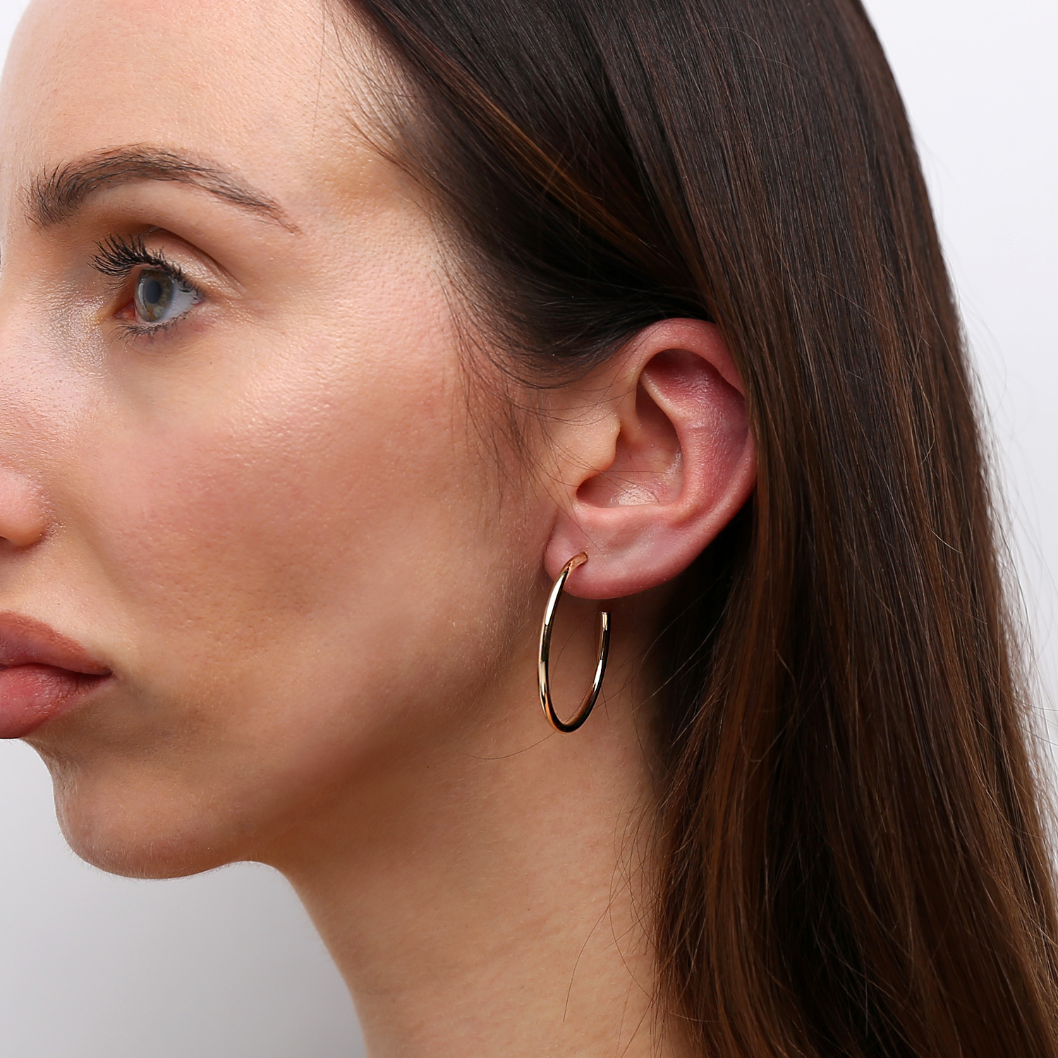 Runde Ohrringe mit einer Höhe von 40 mm in gelb 585-Probe Gold - 14 Karat. Die Ohrringe sind in einer länglichen, ovalen Formglatt und abgerundet, haben eine Stiftbefestigung. Ein schönes, zeitloses Ohrringdesign. Ideale Creolen für ein Geschenk.